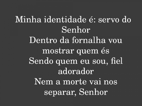 - Minha identidade é: servo do SenhorDentro da fornalha vou mostrar quem ésSendo quem eu sou, fiel adoradorNem a morte vai nos separar, Senhor