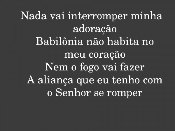 - Nada vai interromper minha adoraçãoBabilônia não habita no meu coraçãoNem o fogo vai fazerA aliança que eu tenho com o Senhor se romper