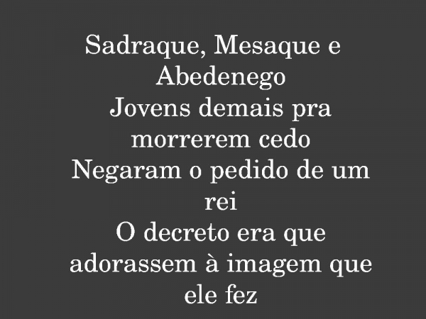 - Sadraque, Mesaque e AbedenegoJovens demais pra morrerem cedoNegaram o pedido de um reiO decreto era que adorassem à imagem que ele fez