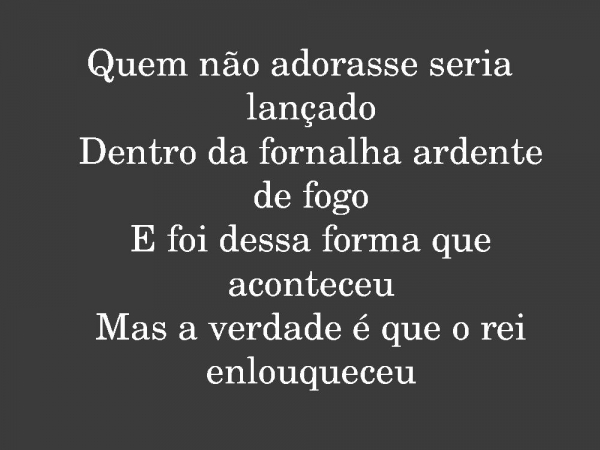 - Quem não adorasse seria lançadoDentro da fornalha ardente de fogoE foi dessa forma que aconteceuMas a verdade é que o rei enlouqueceu