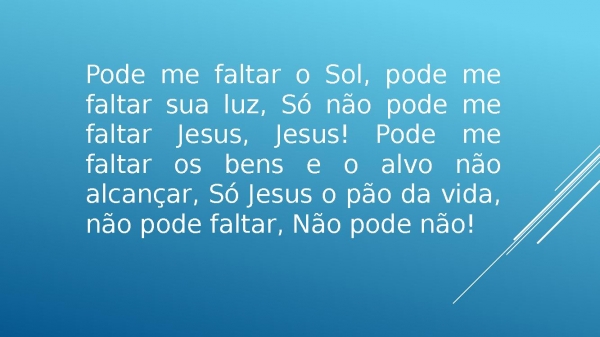 - Pode me faltar o Sol, pode me faltar sua luz, Só não pode me faltar Jesus, Jesus! Pode me faltar os bens e o alvo não alcançar, Só Jesus o pão da vida, não pode faltar, Não pode não!