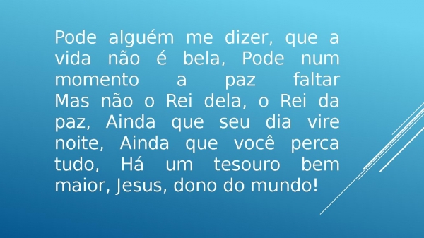 - Pode alguém me dizer, que a vida não é bela, Pode num momento a paz faltarMas não o Rei dela, o Rei da paz, Ainda que seu dia vire noite, Ainda que você perca tudo, Há um tesouro bem maior, Jesus, dono do mundo!