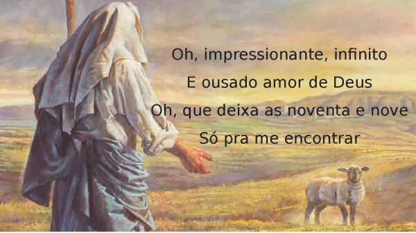 - Oh, impressionante, infinitoE ousado amor de DeusOh, que deixa as noventa e noveSó pra me encontrar