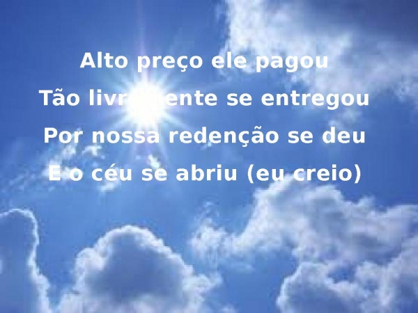 - Alto preço ele pagouTão livremente se entregouPor nossa redenção se deuE o céu se abriu (eu creio)