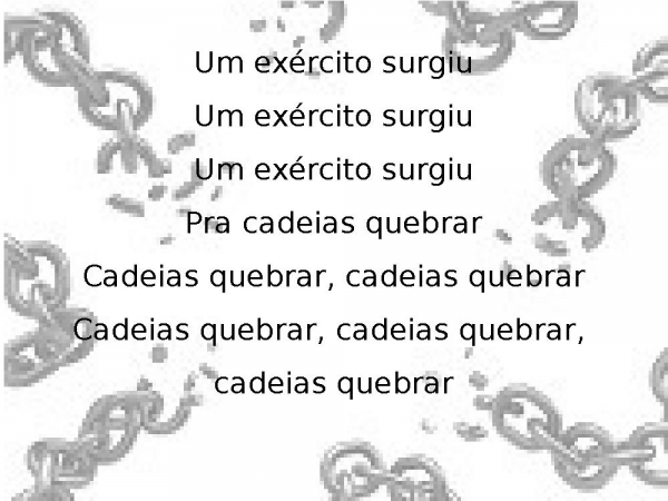 - Um exército surgiuUm exército surgiuUm exército surgiuPra cadeias quebrarCadeias quebrar, cadeias quebrarCadeias quebrar, cadeias quebrar, cadeias quebrar