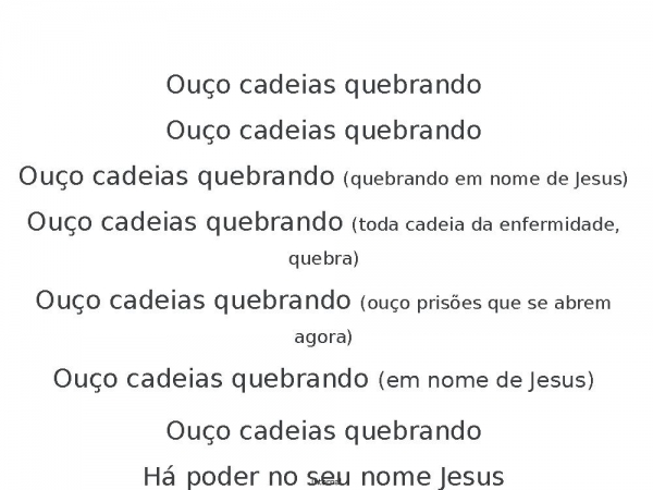 - Ouço cadeias quebrandoOuço cadeias quebrandoOuço cadeias quebrando (quebrando em nome de Jesus)Ouço cadeias quebrando (toda cadeia da enfermidade, quebra)Ouço cadeias quebrando (ouço prisões que se abrem agora)Ouço cadeias quebrando (em nome de Jesus)Ouço cadeias quebrandoHá poder no seu nome Jesus
