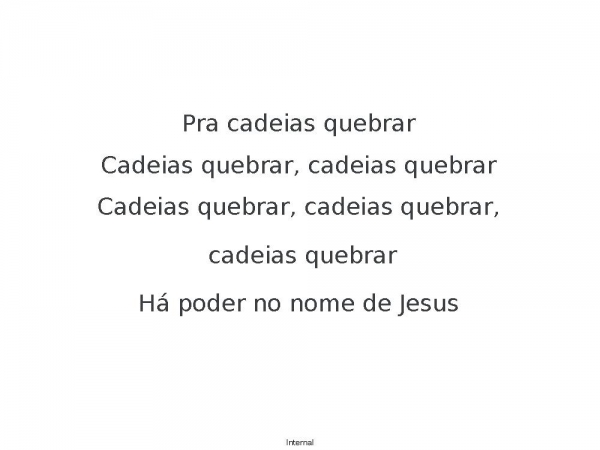 - Pra cadeias quebrarCadeias quebrar, cadeias quebrarCadeias quebrar, cadeias quebrar, cadeias quebrarHá poder no nome de Jesus