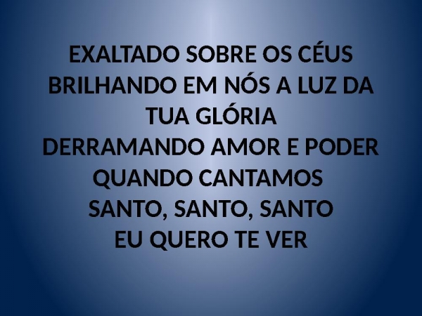 - EXALTADO SOBRE OS CÉUSBRILHANDO EM NÓS A LUZ DA TUA GLÓRIADERRAMANDO AMOR E PODERQUANDO CANTAMOS SANTO, SANTO, SANTOEU QUERO TE VER