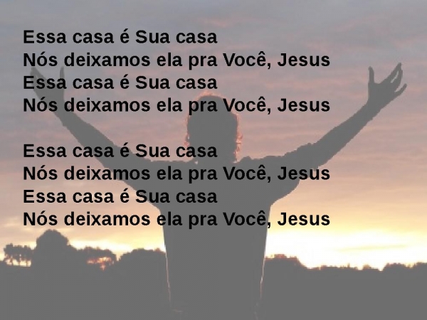 - Essa casa é Sua casaNós deixamos ela pra Você, JesusEssa casa é Sua casaNós deixamos ela pra Você, JesusEssa casa é Sua casaNós deixamos ela pra Você, JesusEssa casa é Sua casaNós deixamos ela pra Você, Jesus