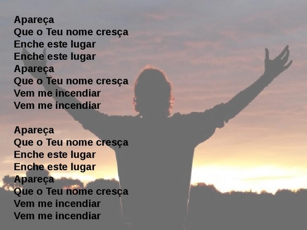 - ApareçaQue o Teu nome cresçaEnche este lugarEnche este lugarApareçaQue o Teu nome cresçaVem me incendiarVem me incendiarApareçaQue o Teu nome cresçaEnche este lugarEnche este lugarApareçaQue o Teu nome cresçaVem me incendiarVem me incendiar