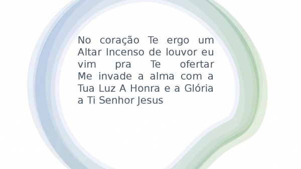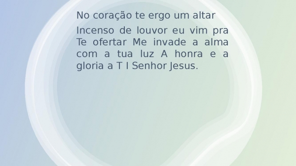 - No coração te ergo um altarIncenso de louvor eu vim pra Te ofertar Me invade a alma com a tua luz A honra e a gloria a T I Senhor Jesus.