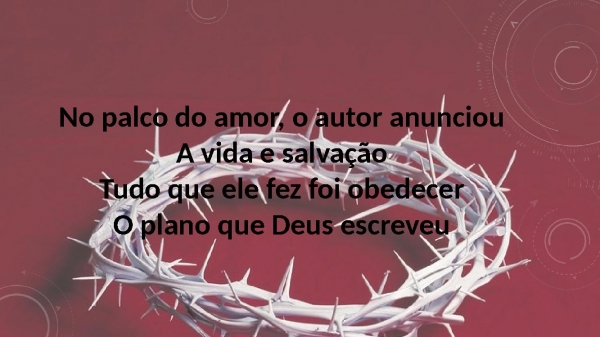 - No palco do amor, o autor anunciouA vida e salvaçãoTudo que ele fez foi obedecerO plano que Deus escreveu