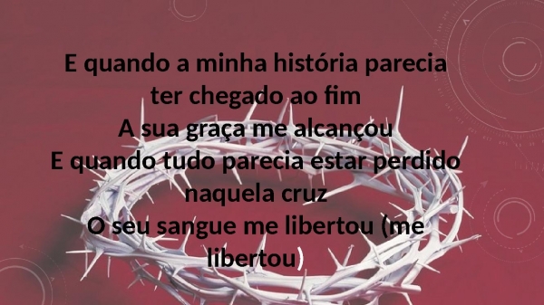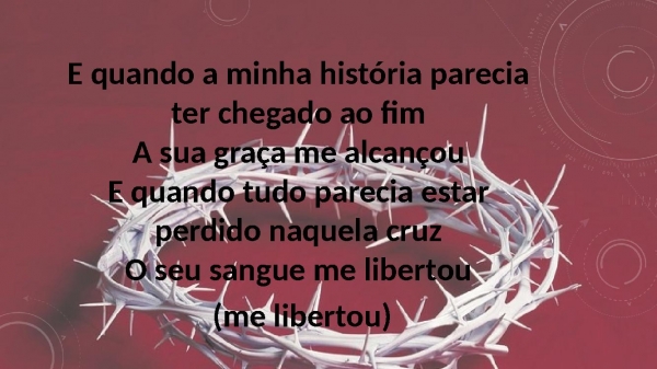 - E quando a minha história parecia ter chegado ao fimA sua graça me alcançouE quando tudo parecia estar perdido naquela cruzO seu sangue me libertou (me libertou)
