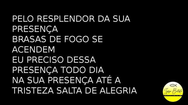 - Pelo resplendor da sua presençaBrasas de fogo se acendemEu preciso dessa presença todo diaNa sua presença até a tristeza salta de alegria