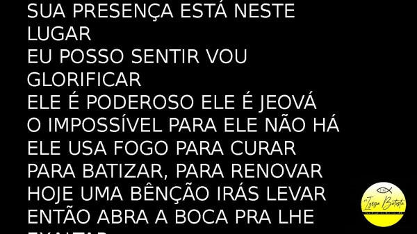 - Sua presença está neste lugarEu posso sentir vou glorificarEle é poderoso Ele é JeováO impossível para Ele não háEle usa fogo para curarPara batizar, para renovarHoje uma bênção irás levarEntão abra a boca pra lhe exaltar