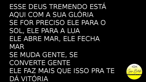 - Esse Deus tremendo está aqui com a sua glóriaSe for preciso Ele para o Sol, Ele para a LuaEle abre mar, Ele fecha marSe muda gente, se converte genteEle faz mais que isso pra te dá vitória