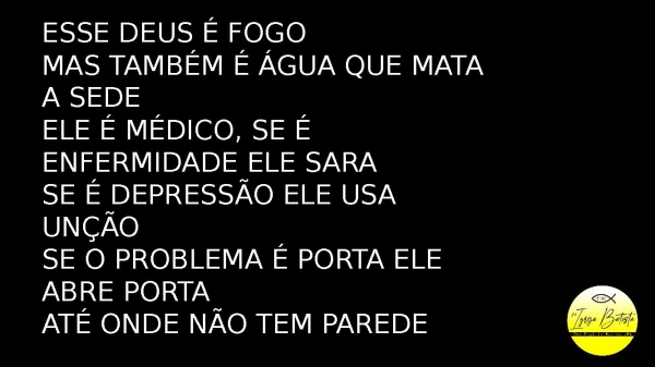 - Esse Deus é fogoMas também é água que mata a sedeEle é médico, se é enfermidade Ele saraSe é depressão Ele usa unçãoSe o problema é porta Ele abre portaAté onde não tem parede