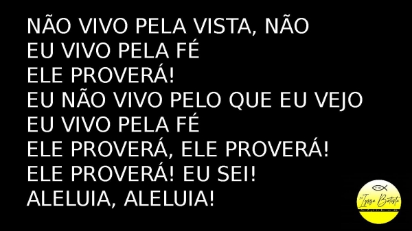 - Não vivo pela vista, nãoEu vivo pela féEle proverá!Eu não vivo pelo que eu vejoEu vivo pela féEle proverá, Ele proverá!Ele proverá! Eu sei!Aleluia, Aleluia!