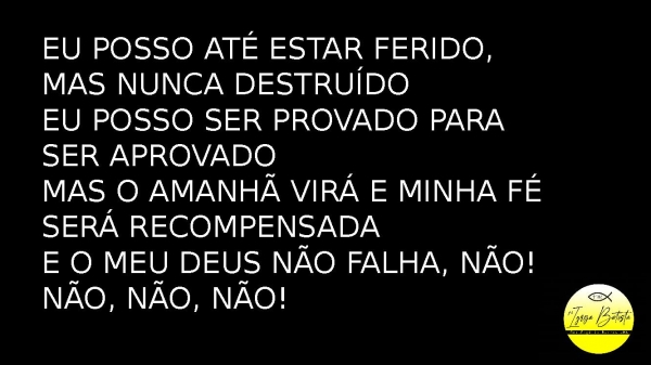 - Eu posso até estar ferido, mas nunca destruídoEu posso ser provado para ser aprovadoMas o amanhã virá e minha fé será recompensadaE o meu Deus não falha, não!Não, não, não!
