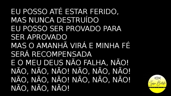 - Eu posso até estar ferido, mas nunca destruídoEu posso ser provado para ser aprovadoMas o amanhã virá e minha fé será recompensadaE o meu Deus não falha, não!Não, não, não! Não, não, não!Não, não, não! Não, não, não!Não, não, não!