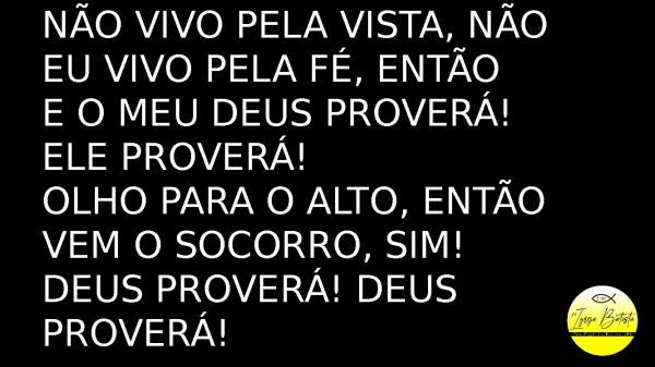 - Não vivo pela vista, nãoEu vivo pela fé, entãoE o meu Deus proverá! Ele proverá!Olho para o alto, entãoVem o socorro, sim!Deus proverá! Deus proverá!