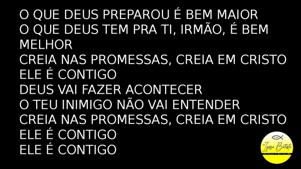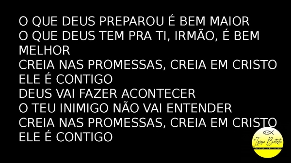 - O que Deus preparou é bem maiorO que Deus tem pra ti, irmão, é bem melhorCreia nas promessas, creia em CristoEle é contigoDeus vai fazer acontecerO teu inimigo não vai entenderCreia nas promessas, creia em CristoEle é contigoEle é contigo