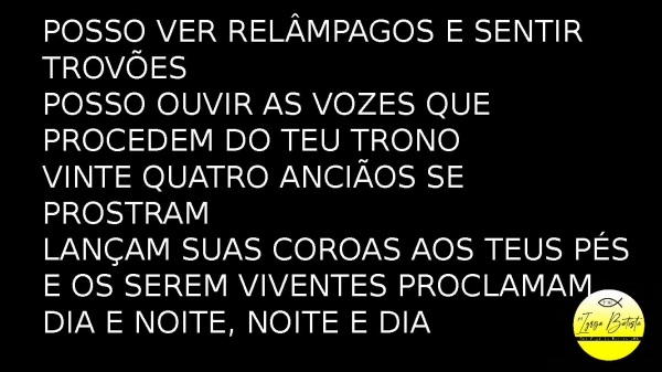 - Posso ver relâmpagos e sentir trovõesPosso ouvir as vozes que procedem do Teu tronoVinte quatro anciãos se prostramLançam suas coroas aos Teus pésE os serem viventes proclamamDia e noite, noite e dia
