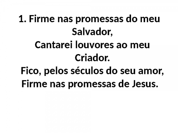 - 1. Firme nas promessas do meu Salvador,Cantarei louvores ao meu Criador.Fico, pelos séculos do seu amor,Firme nas promessas de Jesus.