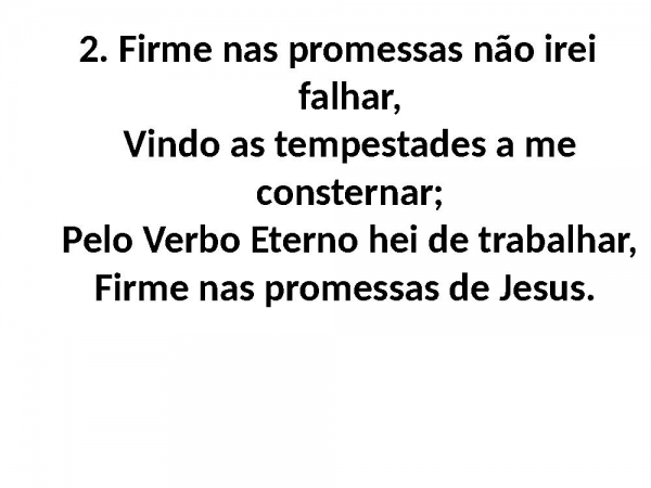 - 2. Firme nas promessas não irei falhar,Vindo as tempestades a me consternar;Pelo Verbo Eterno hei de trabalhar,Firme nas promessas de Jesus.