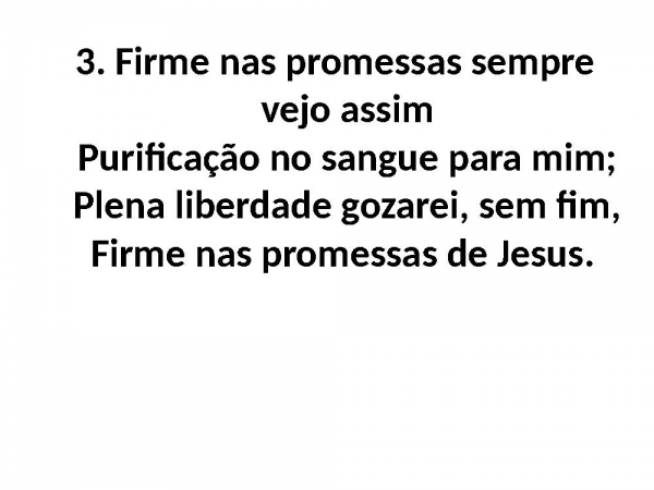 - 3. Firme nas promessas sempre vejo assimPurificação no sangue para mim;Plena liberdade gozarei, sem fim,Firme nas promessas de Jesus.