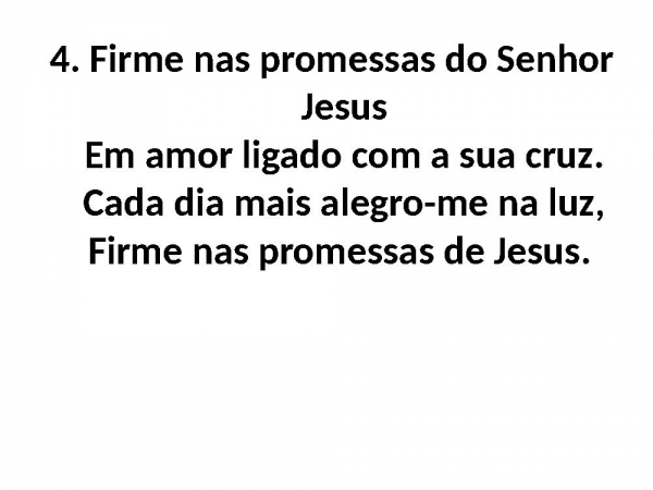 - 4. Firme nas promessas do Senhor JesusEm amor ligado com a sua cruz.Cada dia mais alegro-me na luz,Firme nas promessas de Jesus.