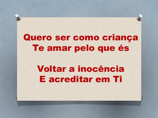 - Quero ser como criançaTe amar pelo que ésVoltar a inocênciaE acreditar em Ti