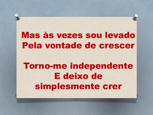 - Mas às vezes sou levadoPela vontade de crescerTorno-me independenteE deixo de simplesmente crer