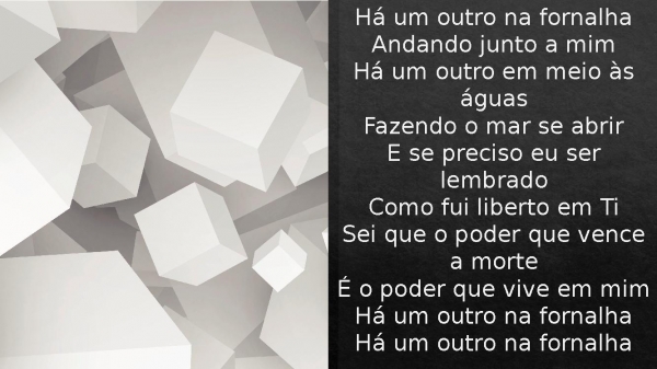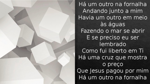 - Há um outro na fornalhaAndando junto a mimHá um outro em meio às águasFazendo o mar se abrirE se preciso eu ser lembradoComo fui liberto em TiSei que o poder que vence a morteÉ o poder que vive em mimHá um outro na fornalhaHá um outro na fornalha