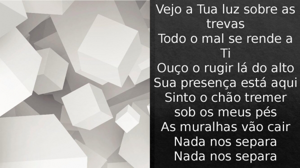 - Vejo a Tua luz sobre as trevasTodo o mal se rende a TiOuço o rugir lá do altoSua presença está aquiSinto o chão tremer sob os meus pésAs muralhas vão cairNada nos separaNada nos separa