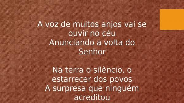 - A voz de muitos anjos vai se ouvir no céuAnunciando a volta do SenhorNa terra o silêncio, o estarrecer dos povosA surpresa que ninguém acreditou