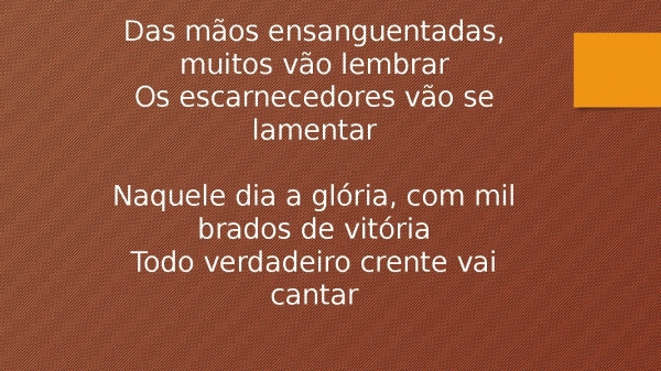 - Das mãos ensanguentadas, muitos vão lembrarOs escarnecedores vão se lamentarNaquele dia a glória, com mil brados de vitóriaTodo verdadeiro crente vai cantar