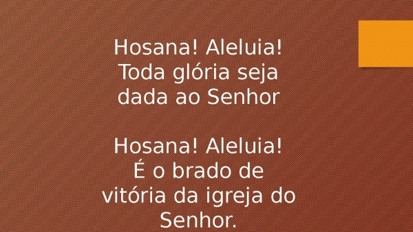 - Hosana! Aleluia!Toda glória seja dada ao SenhorHosana! Aleluia!É o brado de vitória da igreja do Senhor.