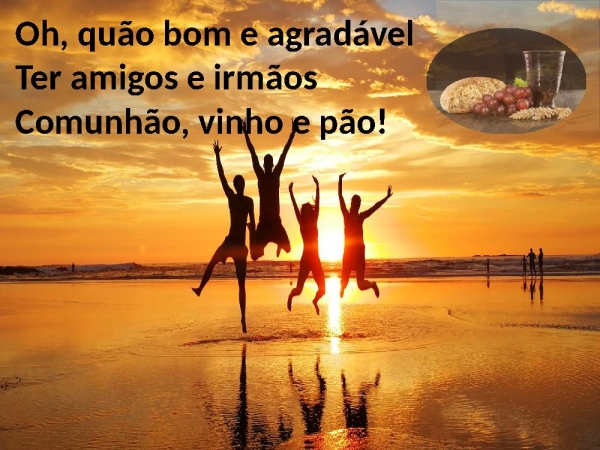 - Oh, quão bom e agradávelTer amigos e irmãosComunhão, vinho e pão!