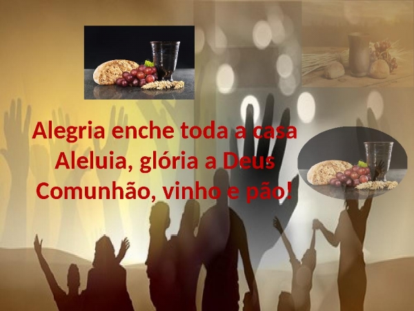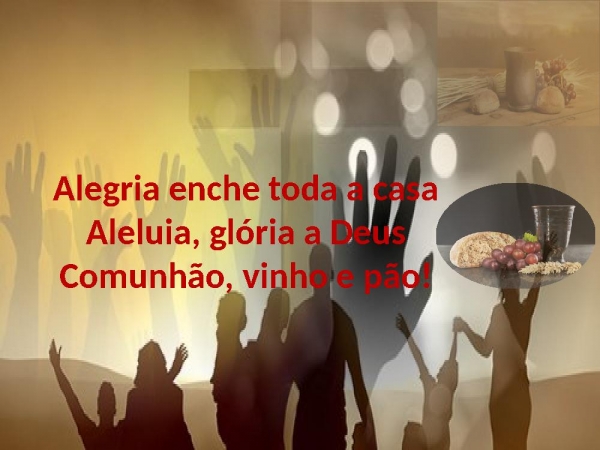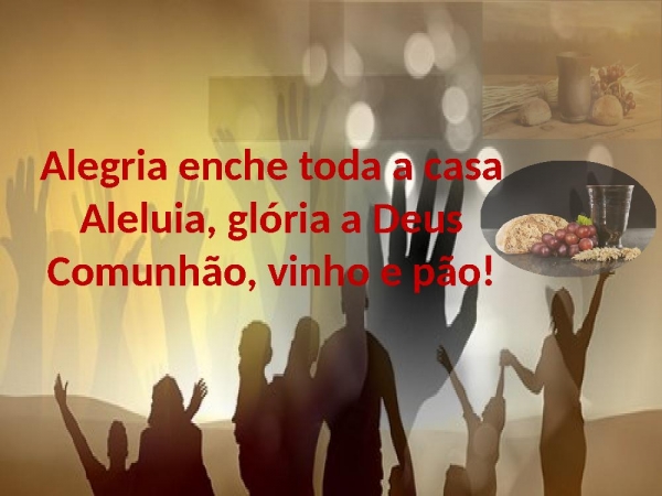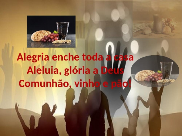 - Alegria enche toda a casaAleluia, glória a DeusComunhão, vinho e pão!