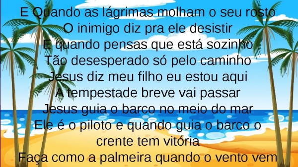 - E Quando as lágrimas molham o seu rostoO inimigo diz pra ele desistirE quando pensas que está sozinhoTão desesperado só pelo caminhoJesus diz meu filho eu estou aquiA tempestade breve vai passarJesus guia o barco no meio do marEle é o piloto e quando guia o barco o crente tem vitóriaFaça como a palmeira quando o vento vem