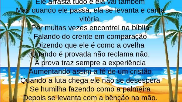 - Ele arrasta tudo e ela vai tambémMas quando ele passa, ela se levanta e canta vitória.Por muitas vezes encontrei na bíbliaFalando do crente em comparaçãoDizendo que ele é como a ovelhaQuando é provada não reclama não.A prova traz sempre a experiênciaAumentando assim a fé de um cristãoQuando a luta chega ele não se desesperaSe humilha fazendo como a palmeiraDepois se levanta com a bênção na mão.