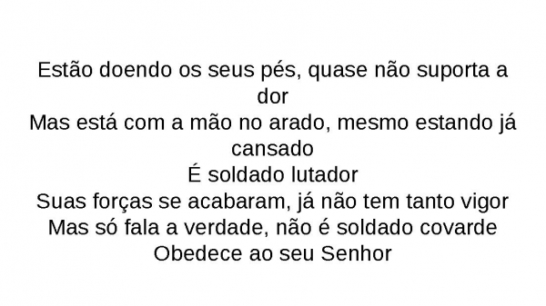 - Estão doendo os seus pés, quase não suporta a dorMas está com a mão no arado, mesmo estando já cansadoÉ soldado lutadorSuas forças se acabaram, já não tem tanto vigorMas só fala a verdade, não é soldado covardeObedece ao seu Senhor
