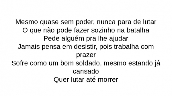 - Mesmo quase sem poder, nunca para de lutarO que não pode fazer sozinho na batalhaPede alguém pra lhe ajudarJamais pensa em desistir, pois trabalha com prazerSofre como um bom soldado, mesmo estando já cansadoQuer lutar até morrer