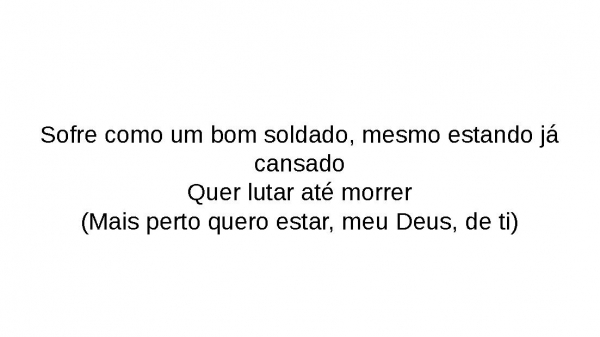 - Sofre como um bom soldado, mesmo estando já cansadoQuer lutar até morrer(Mais perto quero estar, meu Deus, de ti)