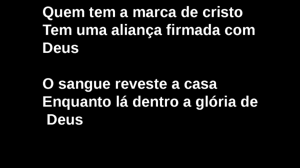 - Quem tem a marca de cristoTem uma aliança firmada com DeusO sangue reveste a casaEnquanto lá dentro a glória de Deus