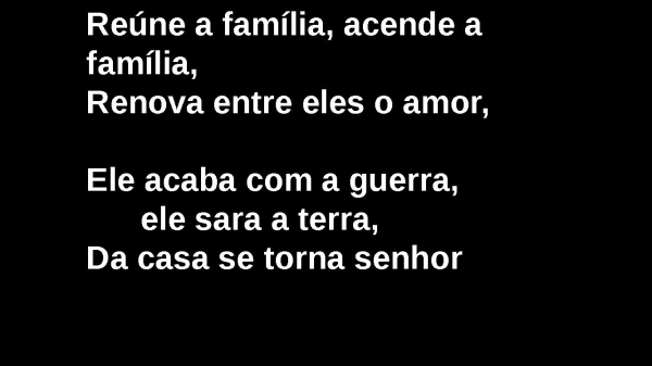 - Reúne a família, acende a família,Renova entre eles o amor,Ele acaba com a guerra, ele sara a terra,Da casa se torna senhor