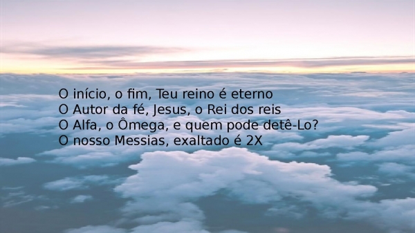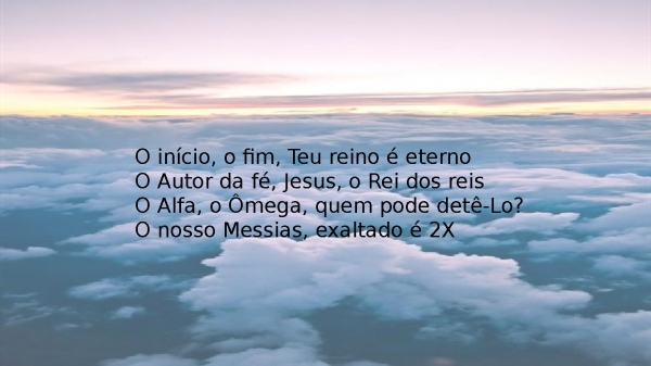 - O início, o fim, Teu reino é eternoO Autor da fé, Jesus, o Rei dos reisO Alfa, o Ômega, quem pode detê-Lo?O nosso Messias, exaltado é 2X