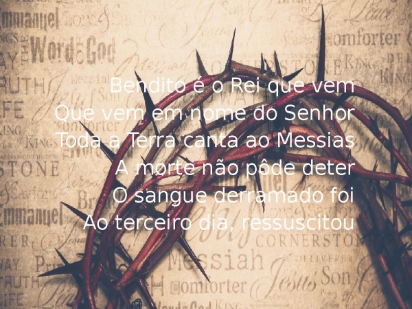 - Bendito é o Rei que vemQue vem em nome do SenhorToda a Terra canta ao MessiasA morte não pôde deterO sangue derramado foiAo terceiro dia, ressuscitou