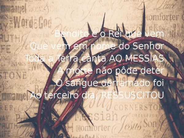 - Bendito é o Rei que vemQue vem em nome do SenhorToda a Terra canta AO MESSIASA morte não pôde deterO sangue derramado foiAo terceiro dia, RESSUSCITOU